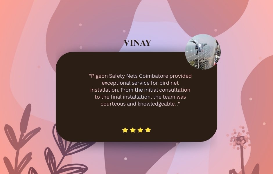 Pigeon Safety Nets Coimbatore is started by Vijay. He understood the quality lacking in current netting industry. Local Players gives wrong commitments, false details about the net for their short term profit. To Build Quality assurance in the industry he started this company